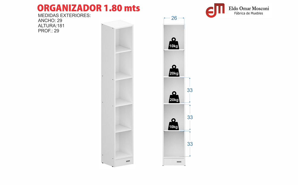 El ORGANIZADOR 180 es un producto que te permitira ordenar mejor algunas cosas que utilizas con mas frecuencia y las queres tener a mano o que simplemente te gusta como quedan a la vista. Inclusive podes unir varios, generando una pared de espacios para almacenar Estantes 5 (3 fijos y 2 regulables) Realizado en melamina 15mm Medidas: 181cms de alto 29cms de ancho 29cms de profundidad UNICO COLOR MEZO /BLANCO COMBINADO .
