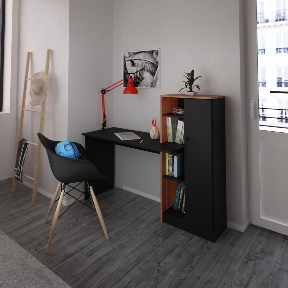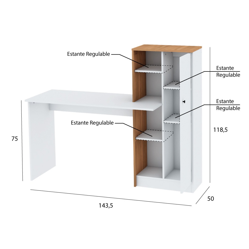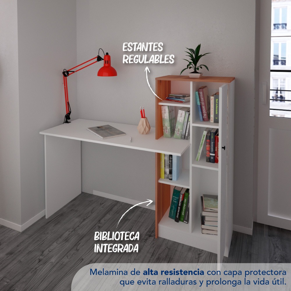 Este escritorio de melamina es de un tamaño ideal para ubicarlo en cualquier rincón de la casa. Se puede adaptar a una pared amplia como a cualquier otro sector. Contiene un mueble organizador para que organices tu hogar como más te guste.
