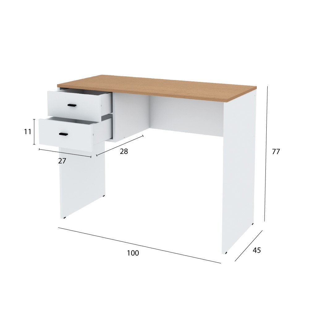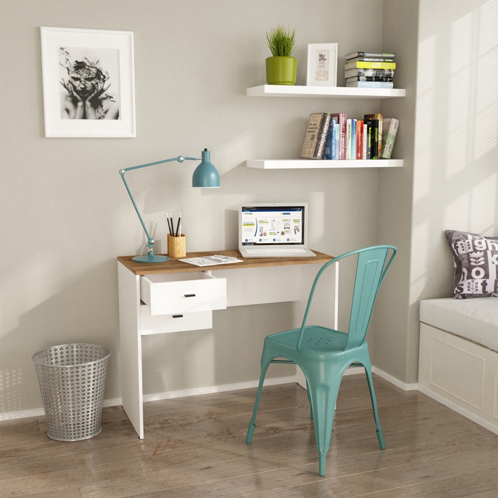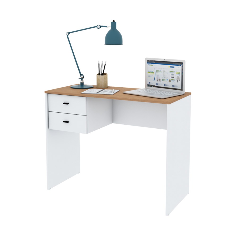 Escritorio de melamina de un tamaño ideal para ubicarlo en cualquier rincón de la casa. Contiene dos cajones para organizar tus apuntes o material de trabajo.