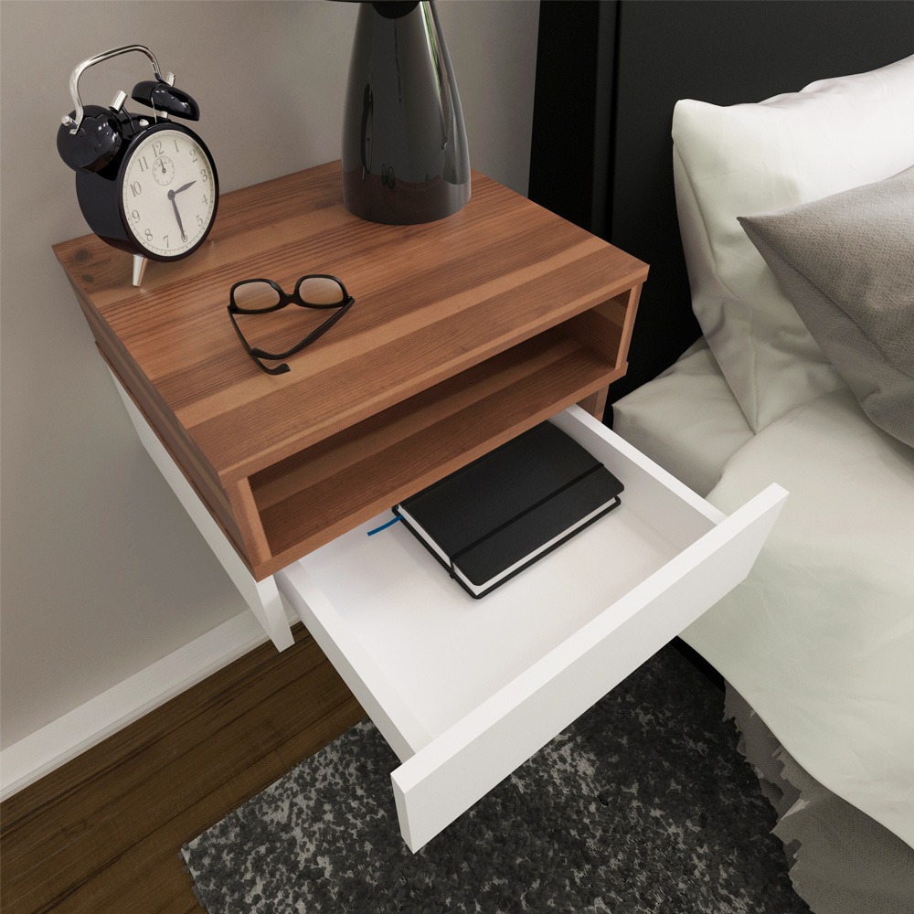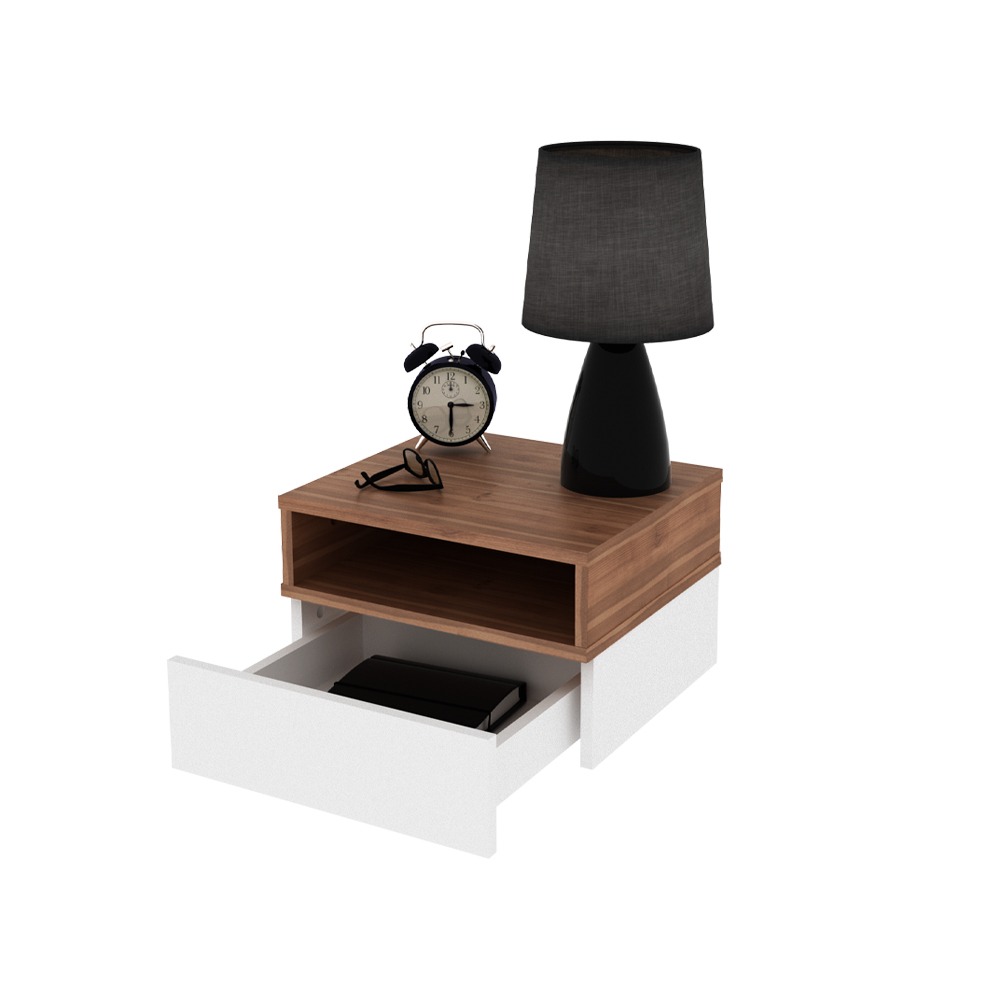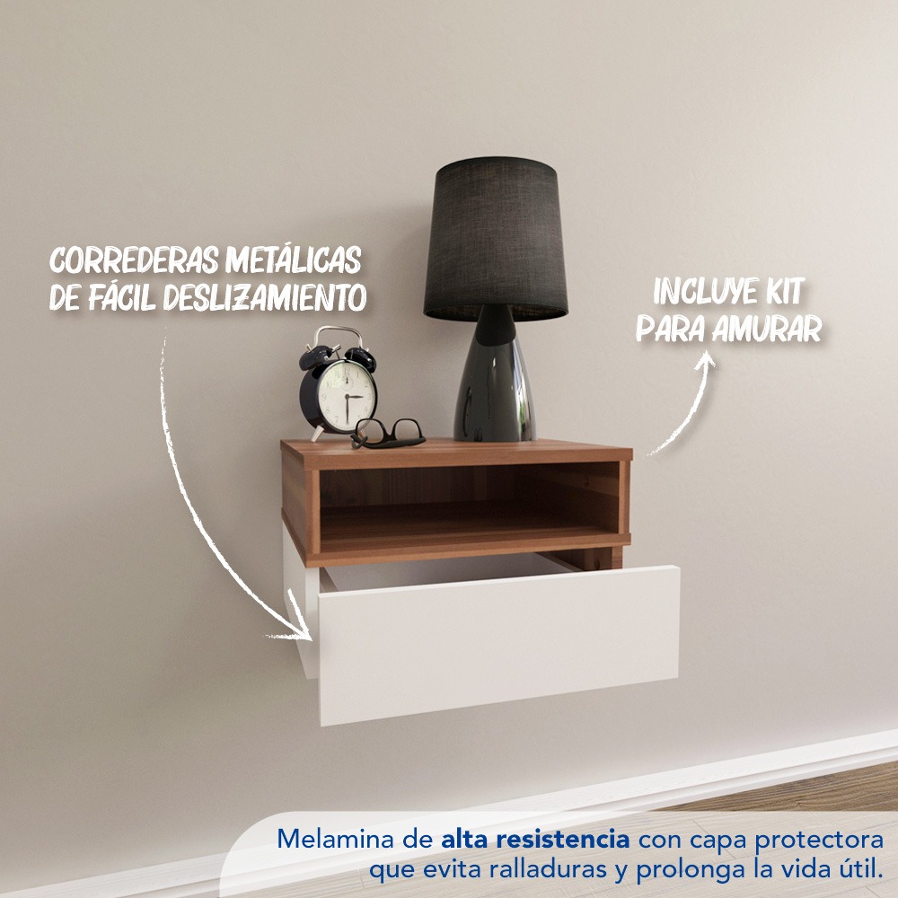 Características: Mesa flotante con bandeja desayunador, 1 cajón, 1 estante, correderas metálicas.